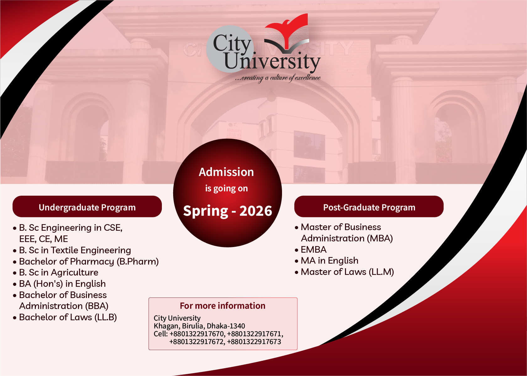 The vision of City University is to create a culture of excellence in higher education and research to accelerate national development by establishment of an institution of higher learning that is responsive to society’s needs for the 21st century and beyond. A firm resolve of our founder is that no merit shall be wasted only because of poverty. It is with Pride and Honor that City University marches forward for a better Bangladesh, for an achievement of excellence, and for a better tomorrow.